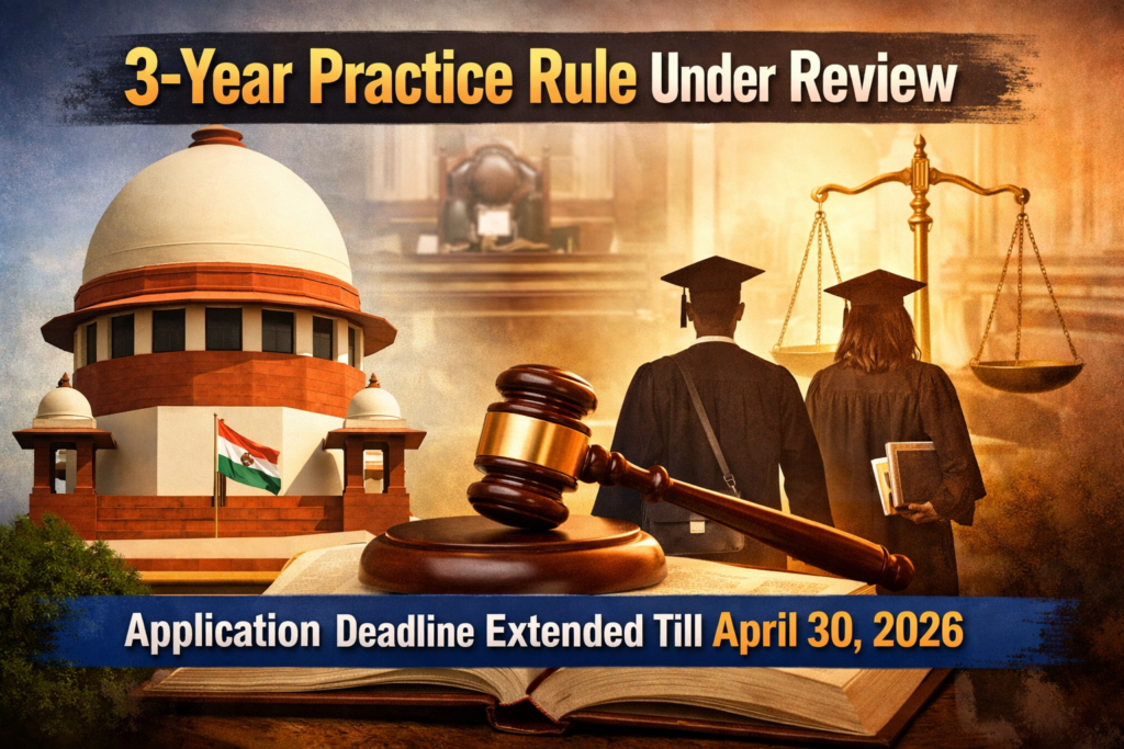 The debate over the three-year practice requirement for entry into the judiciary has once again reached the of Supreme Court of India. During a recent hearing, the Court clarified that the rule requiring advocates to complete three years of legal practice before applying for the post of Civil Judge (Junior Division) will continue for the time being. At the same time, the Court observed that the main concern is not the rule itself, but the way it should be properly implemented.